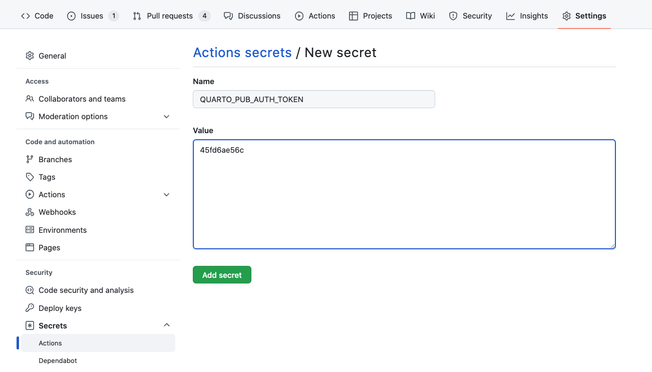 Add the Quarto Pub access token to your repository’s action Secrets (accessible within repository Settings). You will see a New repository secret button at the top right: